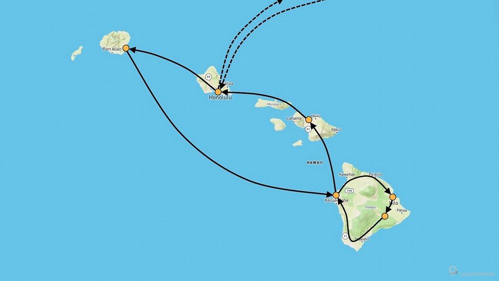 Au final, nous avons retenu la combinaison suivante, qui était la plus avantageuse: O'ahu => Kauai => Big Island => Maui => Oahu.