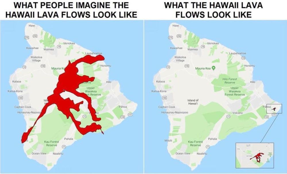 L'image ci-dessous montre avec humour la taille réelle de zone impactée par les coulées (à droite), contrairement à ce que beaucoup s'imaginaient (à gauche).