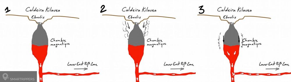 Schéma 1: Le magma est désormais recouvert par les éboulements qui font pression sur la chambre magmatique. Schéma 2: Sous pression, la chambre magmatique se vide peu à peu vers la fissure 8 de la Lower East Rift Zone. De plus, des contraintes se font ressentir dans l’ensemble de la caldeira du Kilauea et engendrent des mouvements de terrain d’une magnitude de 3 sur l’échelle de Richter. Schéma 3: La chambre magmatique se vidant, elle se remplie d'éboulis à chaque nouveau séisme. Les secousses les plus fortes de magnitude supérieure à 5 provoquent directement un affaissement vertical dans le fond du cratère et un dégagement de poussière. La pression sur la chambre magmatique accroît d'autant l'écoulement de la lave vers la Lower East Rift Zone.