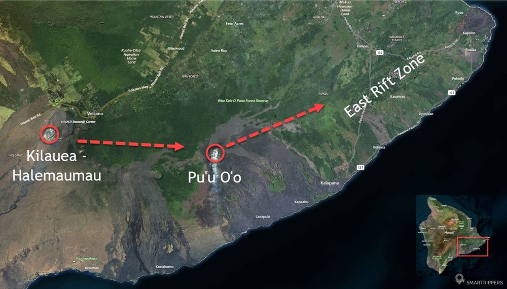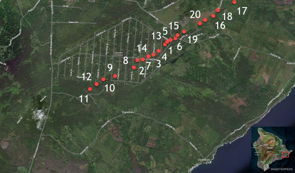 La première fissure s'ouvre le long de la Lower East Rift Zone dans le quartier résidentiel des Leilani Estates situé à l’est de l'île, à 25 km du cratère actif du Pu’u O’o et 42 km du Kilauea, obligeant les habitants à fuir leurs maisons.
