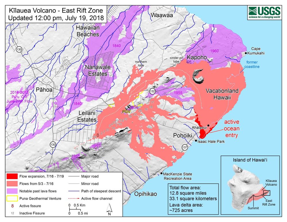 Mise à jour du 20/07/2018 : Le fleuve de lave de la fissure 8 ne montre toujours pas de signe de faiblesse, entrant dans l’Océan sur une largeur de 6 kilomètres, principalement dans le secteur d’Ahalanui mais également dans la zone de Kapoho mais de façon très limitée. Le flot principal menace désormais le Isaac Hale Park et sa Pohiki boat ramp où les pêcheurs locaux avaient l’habitude de s’élancer en mer. Les autorités mettent en garde les personnes qui comptent se rendre sur place en bateau pour observer l’entrée de la lave dans l’Océan : des explosions hydro-volcaniques comparables à celle mentionnée dans la précédente mise à jour sont susceptibles de se reproduire.