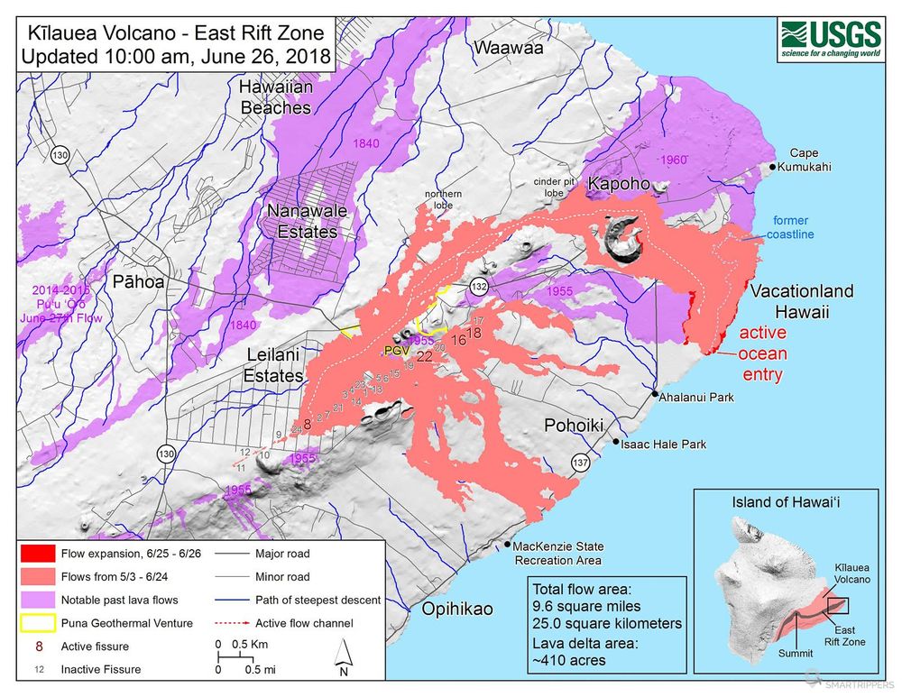 Mise à jour du 14/06/2018 : Les fissures 16 et 18 se sont ré-ouvertes et produisent à nouveau une faible quantité de lave. Le fleuve de lave principal alimenté par la fissure 8 poursuit toujours sa course vers l'océan et construit peu à peu un nouveau plancher, agrandissant l'île au sud de Kapoho. La zone de contact avec l'océan est très large (environ 1,5 km). Des excursions en bateau bien encadrées sont organisées pour ceux qui sont sur place et souhaitent voir la lave entrer dans l'eau (n'y allez pas seul, il y a un fort risque d'explosion de la lave au contact de l'eau et un dégagement très toxique). Les émanations de gaz depuis la fissure 8 se sont intensifiés ces derniers jours et les vents changeant exposent les zones centre, sud et ouest de Big Island au VOG (particules légères pouvant provoquer des irritations chez les personnes sensibles). Pour en savoir plus sur le VOG, la carte des zones touchées et les risques associés, vous pouvez consulter ce site (en anglais): https://vog.ivhhn.org/