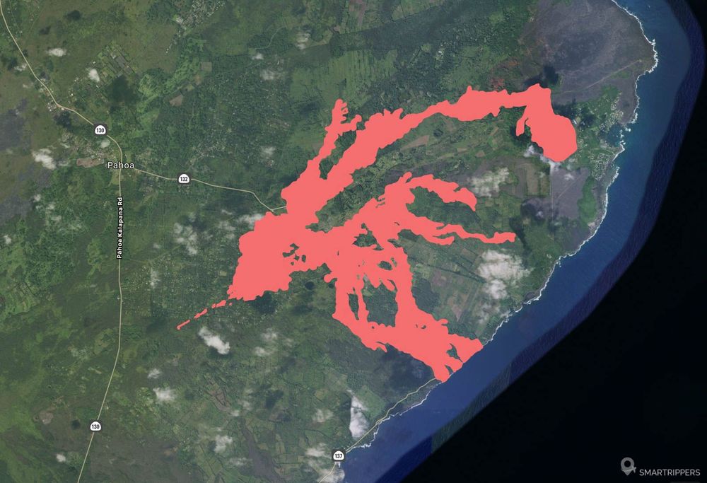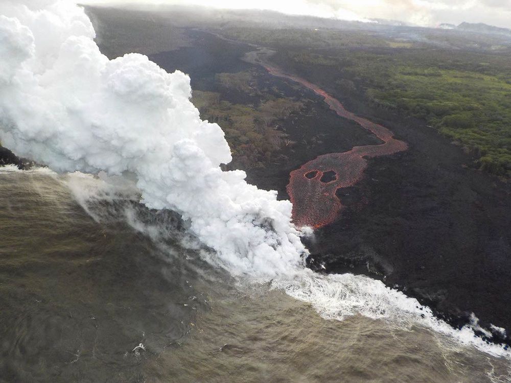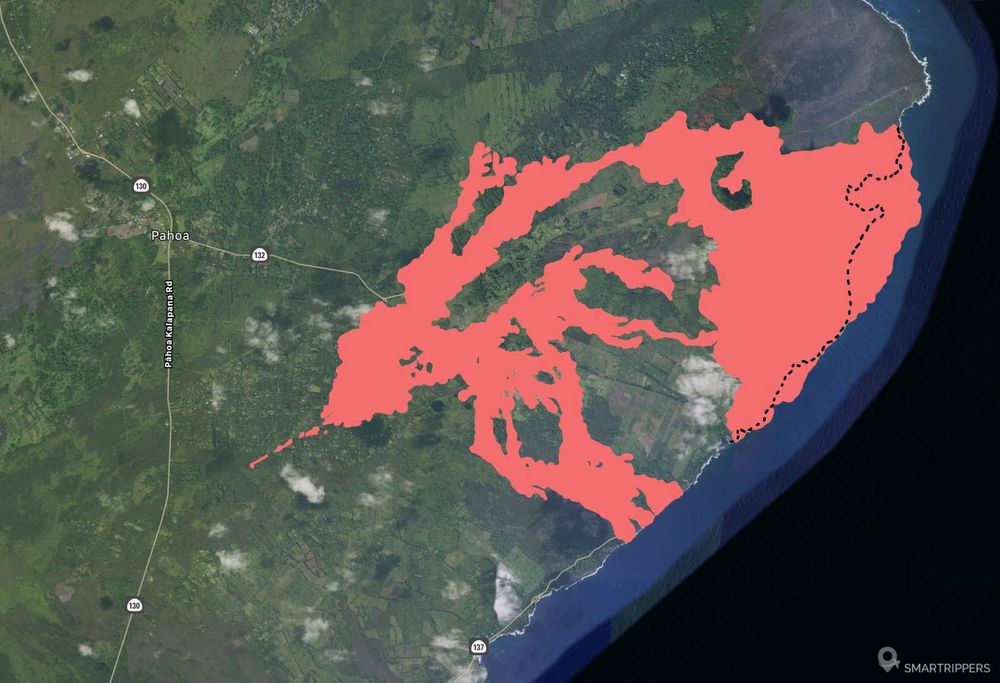Le mois suivant, la lave de la fissure 8 continue toujours de s'écouler vers Kapoho Bay et atteint le Pacifique, détruisant la quasi totalité des habitations de la zone et créant un large delta de lave. Ce delta et les autres incursions de lave dans l'océan ont créé 3.5km² de nouvelles terres.