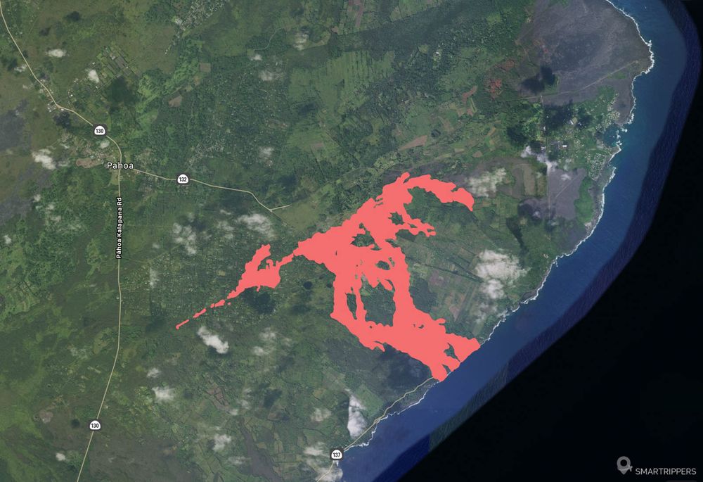 Mise à jour du 04/06/2018 : La fissure numéro 8 est désormais la seule à produire de la lave. Cette lave a pris la direction du nord-est, contournant la centrale PGV et se dirige tout droit vers Kapoho à l’Est en empruntant temporairement le trajet de la coulée de 1960, recouvrant au passage Four Corners (carrefour entre les routes 132 et 137). Depuis hier, la coulée a ravagé 1/4 des habitations de Kapoho, faisant également disparaître le magnifique Green Lake en l’espace de 3h (profond lac niché dans le cratère Waiapele ou « Lac de Pele », situé à l’ouest de Kapoho). Le front de la coulée est très large et se dirige désormais vers l’un des endroits les plus beaux et paradisiaques de Big Island. Le secteur de Kapoho abrite plusieurs baies magnifiques bordées d'une végétation luxuriante mais également les célèbres Kapoho Tidepools, ces piscines naturelles tapissées de magnifiques coraux qui sont à nos yeux le plus beau spot de snorkeling d'Hawaii. La lave file tout droit vers le quartier résidentiel de Vacationland Hawaii menaçant d'engloutir d'ici quelques heures plusieurs dizaines de nouvelles maisons. Les fissures les plus à l’ouest (9, 10, 11 et 12) sont surveillées de près car un regain d’activité y a été constaté: les fissures se sont agrandies en largeur et les vapeurs dégagées se sont intensifiées, laissant penser à un prochain épanchement de lave. Les éruptions explosives quant à elles continuent au sommet du Kilauea, dans un Volcanoes National Park toujours fermé au public. Ce matin (en France) un nouveau séisme de magnitude 5.5 a secoué le Volcanoes NP engendrant un gros panache de fumée. Du côté des routes, la 137 est maintenant coupée au niveau de Koae, la 132 est interdite de bout en bout, et c’est également le cas pour la Kamaili Road.