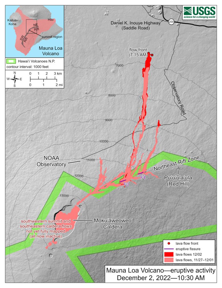 >> Mise à jour du 03/12/2022: La fissure 3 est la seule à produire de la lave. Comme prévu précédemment, la coulée ralentit avec la pente qui est beaucoup plus légère aux abords de la Saddle Road, à un rythme de 13m/h. A 7h00 (heure locale), la coulée se situe à 4 km de la Highway. Les abords de la Highway offrent un panorama saisissant de nuit. On voit très bien les coulées depuis la route à l'oeil nu!