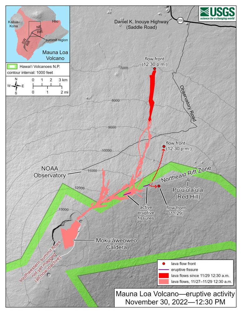 27 novembre 2022, 23:30 heure locale, le Mauna Loa décide se réveiller après 37 ans de repos. 3 fissures s'ouvrent au niveau de la Northeast Rift Zone, projetant des gerbes de lave atteignant 60 mètres de haut! La Mauna Loa Observatory road qui monte près du sommet du Mauna Loa a été fermée. Pour l'instant, aucune évacuation n'a été ordonnée, la coulée ne se situant qu'à 16 km de la Saddle Road (la route qui relie les villes de Kona et d'Hilo).