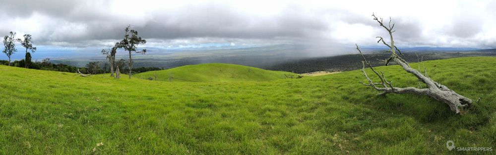 Une fois que vous avez atteint le col, ne vous y attardez pas, la vue est bouchée par les arbres en contrebas. Préférez tourner à gauche pour rejoindre la partie la plus haute du cône qui vous offrira une sympathique vue sur les contreforts du Hualālai au sud, du Mauna Kea à l'est et du Kohala au nord ainsi que de la côte de Kona jusqu'à l'extrême nord de l'île.