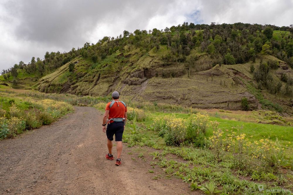 La piste de cailloux continue de monter au travers de ce qui deviendra des sortes d'alpages verdoyants où vous pourrez croiser chèvres, moutons ou Nēnēs.
