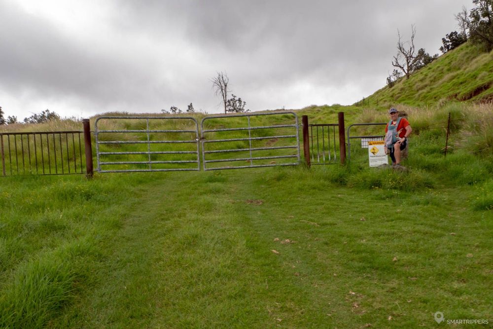 Une fois arrivés à la base du petit volcan, la piste se recouvre d'herbe pour finir par se transformer en chemin. Il faut à partir de là, viser le portail qui se trouve sur la droite du chemin principal. Cela vous permettra de franchir la clôture et d'accéder au chemin qui monte au sommet du cône.