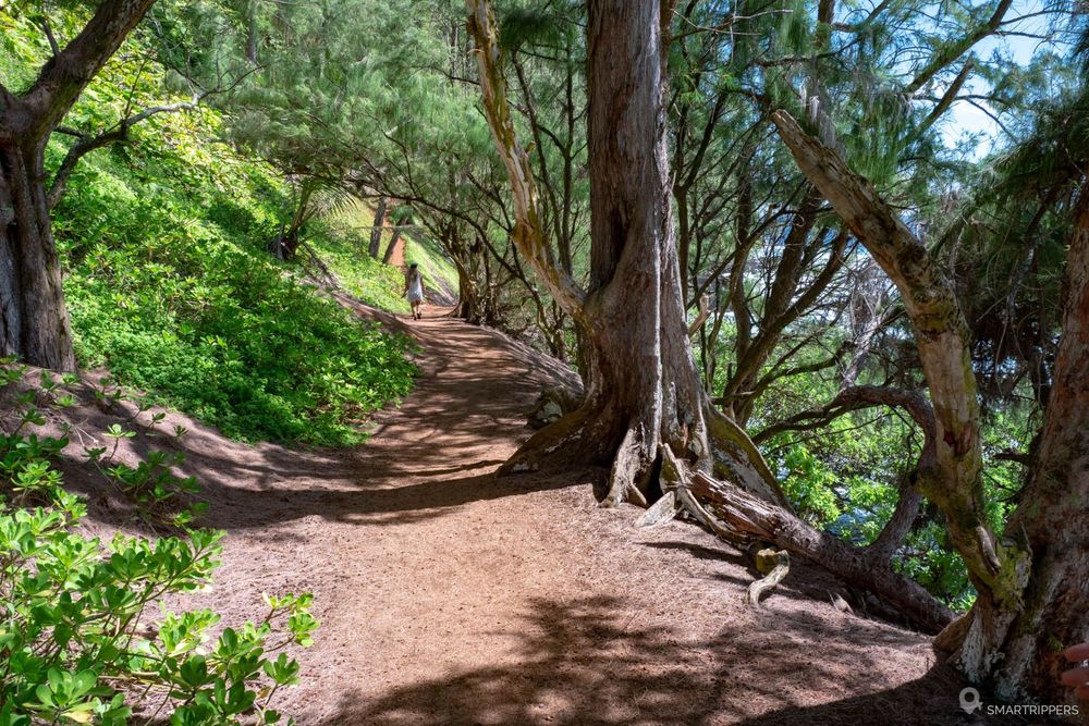 Car le revers de la médaille est que l'accès à Red Sand Beach n'est pas des plus aisés. Bien qu'il soit court, le sentier de 350m est assez raide et glissant. Ce dernier est en effet recouvert de nombreuses épines de pins ainsi que d'une terre assez friable, ce qui le rend dangereux même par temps sec.