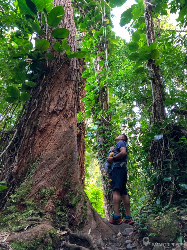 Voici un court sentier qui vous permettra de découvrir la forêt tropicale et sa végétation luxuriante, parsemée ici de gros eucalyptus et autres arbres aux racines géantes.