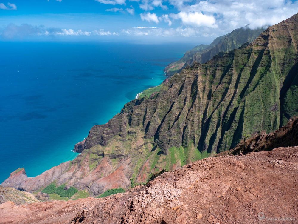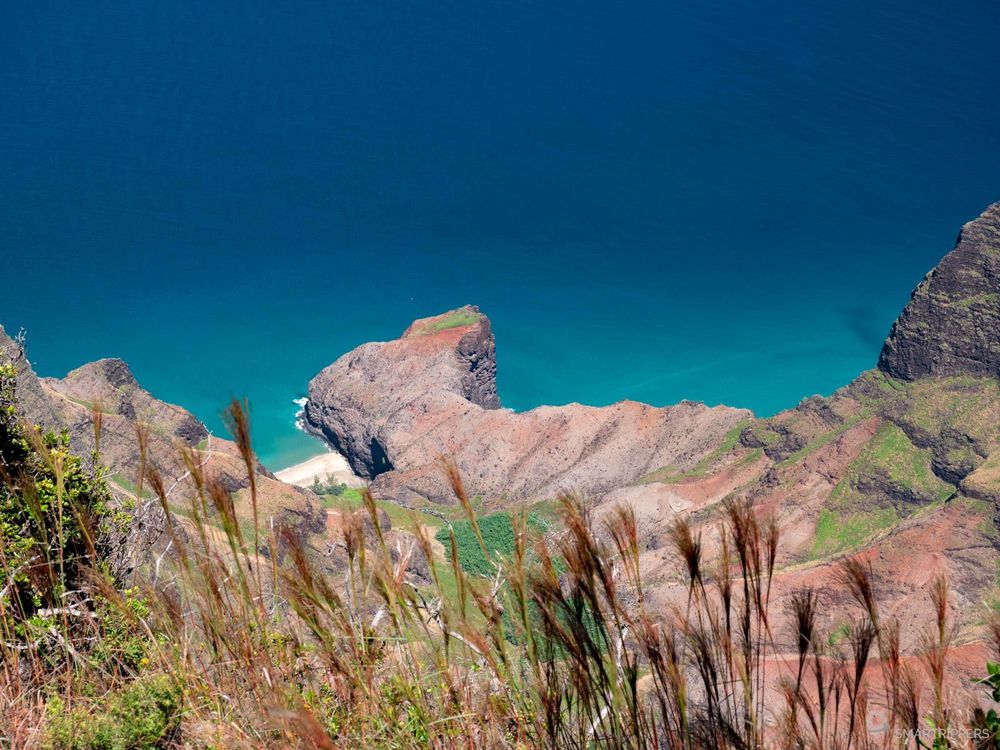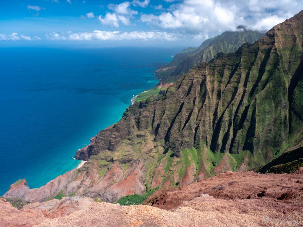 Les couleurs du sol friable se mélangent dans une palette de jaune, d'ocre, d'orangé et de rouge, qui contrastent avec les pentes verdoyantes du relief dentelé de la Na Pāli coast, le tout baigné dans l'immensité du bleu de la mer. On en prend plein les yeux, c'est juste magique!