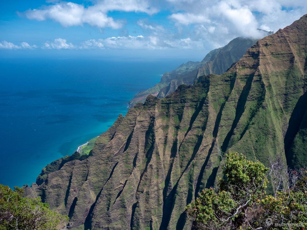 Tout au bout de la Na Pāli coast, l'on devine le récif de la plage de Kee Beach qui marque le début du célèbre Kalalau trail dont on voit se faufiler le sentier à plusieurs centaines de mètres plus bas. Au dessous, l'on distingue clairement la partie ouest d'Honopu Beach et à sa droite le promontoire rocheux qui abrite la Honopu Arch qui permet de rejoindre la partie est d'Honopu Beach.