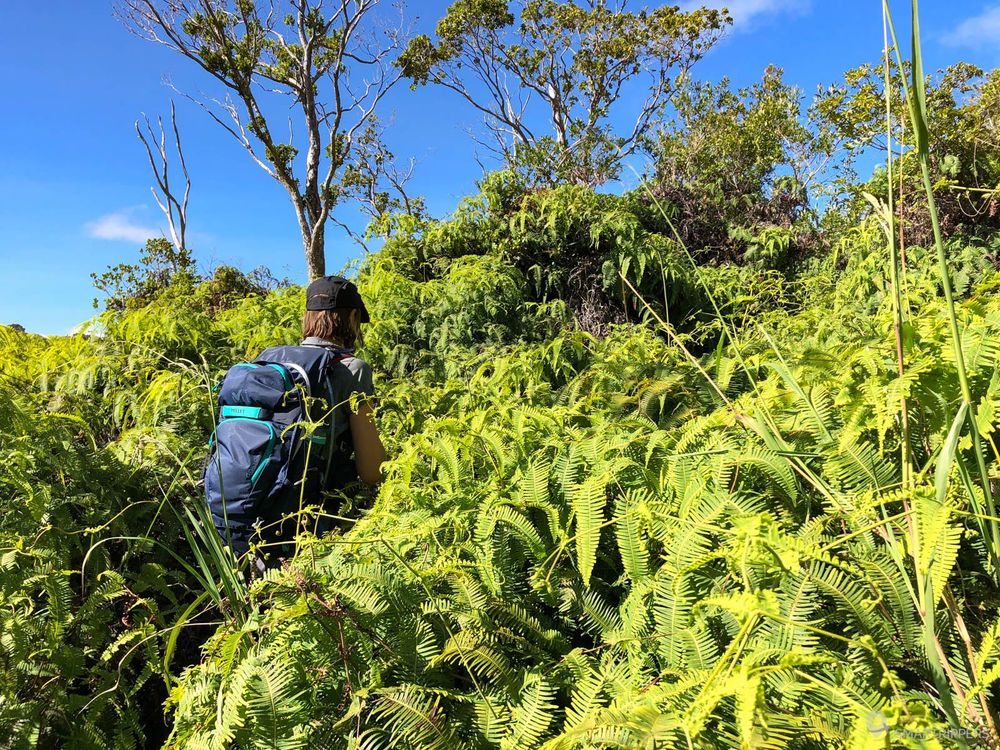 Après environ un quart d'heure de marche, on atteint la première portion de fougères. Ces petits arbustes qui ont l'air tout mignons vus d'en haut n'hésiteront pas à vous lacérer les jambes si vous n'avez pas pensé à mettre un pantalon! En effet, les fougères poussant rapidement, elles sont régulièrement coupées par les volontaires afin de dégager le chemin. Les pousses coupées se transforment alors en bois sec et coupant.