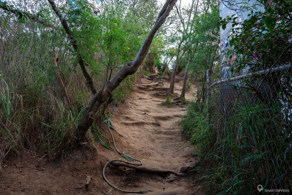 Le trail commence au niveau de la « raquette » ou zone de demi-tour au bout de Kamahele Street. Vous ne pourrez pas vous tromper car la route est ensuite dans une zone privée, fermée par un portail. Vous observerez un escalier sur la droite au niveau de la zone boisée, c’est ici que commence l’ascension vers la ridge menant aux Pillboxes.