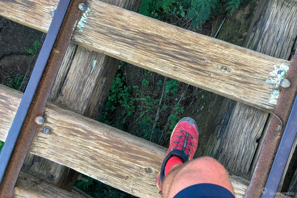 La plus grosse difficulté se trouve donc ici... enfin si vous n'êtes pas sujet au vertige, car arrivés un peu avant le milieu de l'ascension, vous serez confrontés à une zone de vide. C'est à dire que sous les rails et les traverses du chemin de fer, un vide de 2 ou 3 mètres est présent sur une petite cinquantaine de mètres.