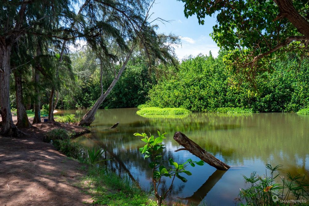 En contrebas, la Huleia river s'écoule paisiblement dans un écosystème particulier de mangrove qui a été colonisée par une espèce de Palétuviers rouges (invasifs à Hawaii). Un projet est d'ailleurs en cours par une équipe de bénévoles ayant pour but d'éliminer l'espèce invasive et de reboiser les bords du fishpond avec des essences hawaiiennes.
