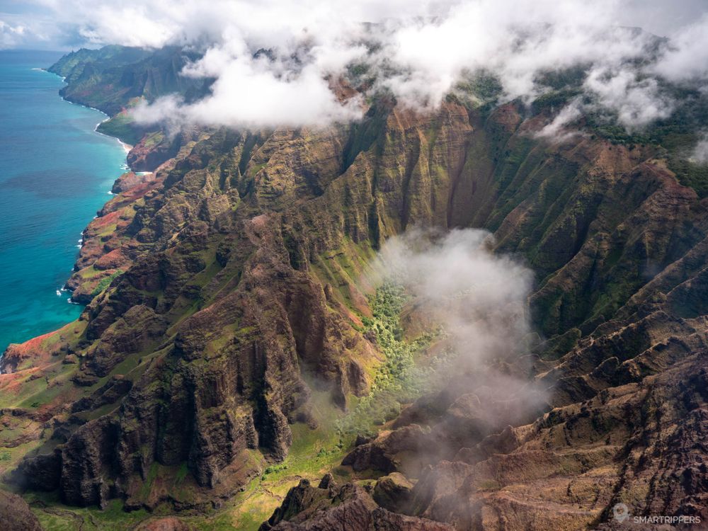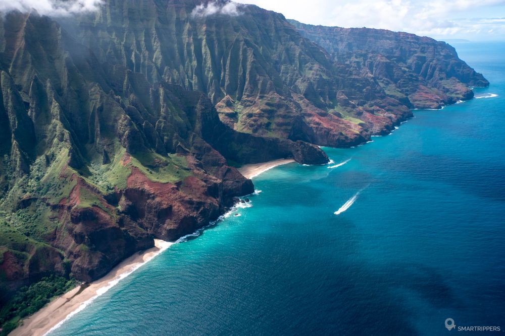 Le clou du spectacle: la somptueuse Nā Pali Coast et ses cathédrales de roches qui plongent dans le bleu de l'océan. C'est l'un des plus beaux panoramas qu'il nous a été donné de découvrir à Hawaii! Mais ce n'est pas tout, car Kauai possède d'autres paysages qui lui ont valu d'avoir été choisie comme décor de tournage de nombreux films comme la Saga Jurassic Park. Sa célèbre cascade n'est d'ailleurs visible que depuis le ciel!