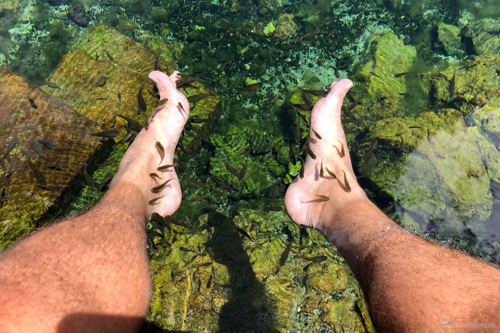 L'endroit est idéal pour se rafraîchir! Au premier pied dans le bassin des dizaines de petits poissons mangeurs de peaux viennent s'attabler et nous picorer les pieds. Il suffit de bouger un peu pour qu'ils s'en aillent et ne sont pas embêtants si vous décidez d'aller nager plus loin.
