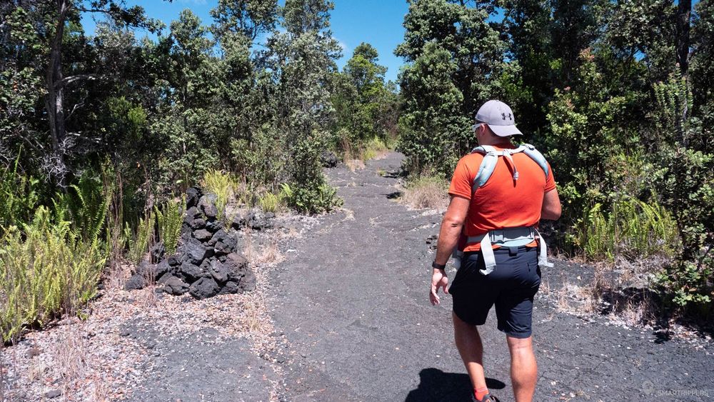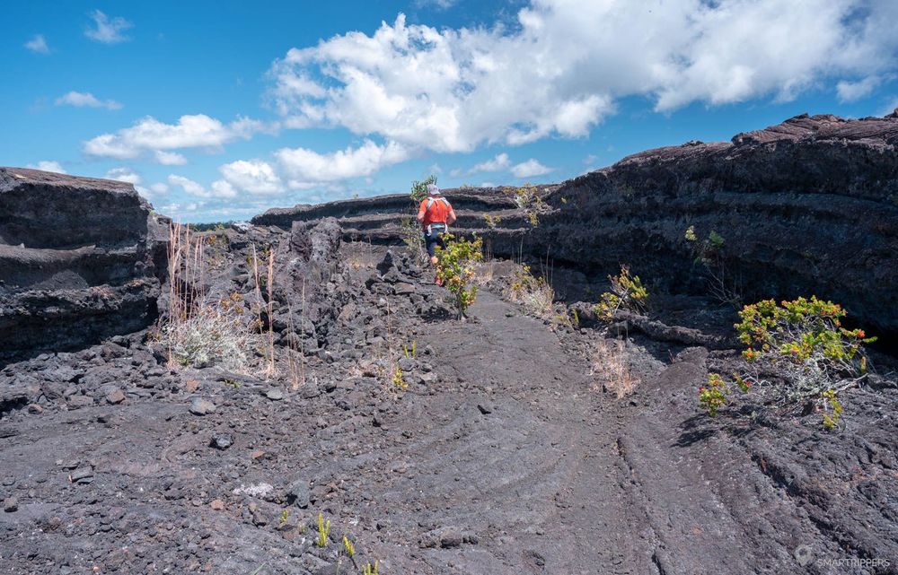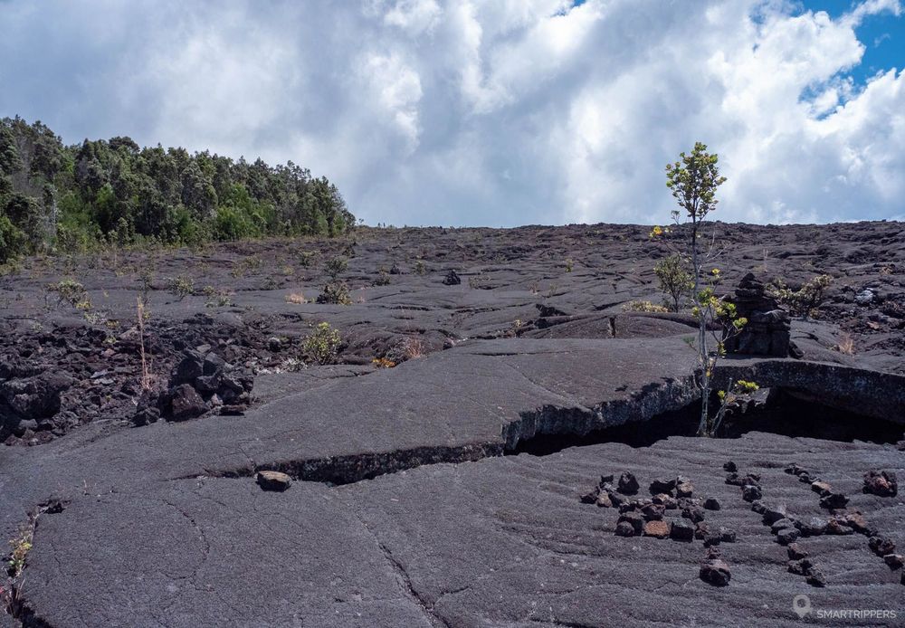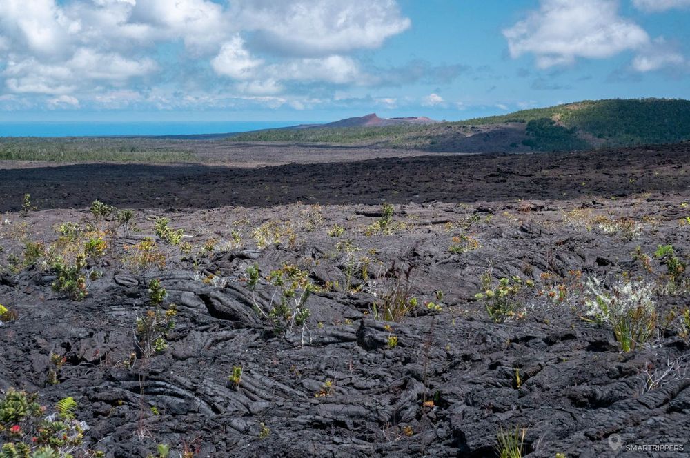 Le sentier sort rapidement de la végétation et entre dans l'immense champ de lave au pied du Mauna Ulu, le volcan le qui domine la zone et d'où s'échappent encore quelques fumerolles. Les cairns nous maintiennent sur la droite, en bordure de la forêt avant de poursuivre derrière le Mauna Ulu.