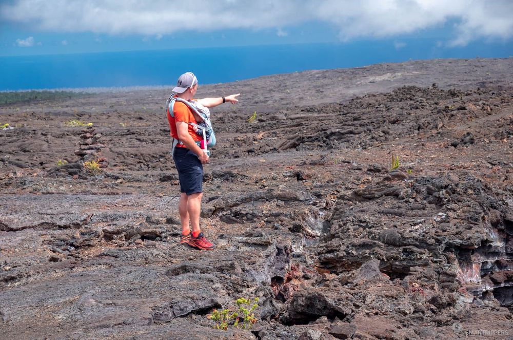 Au fur et à mesure que l’on avance dans le grand champ de lave, l’on aperçoit de mieux en mieux le Pu`u `Ō`ō qui s’est arrêté de fumer mi-2018. Son cône de couleur ocre et rouge semble encore tout chaud!