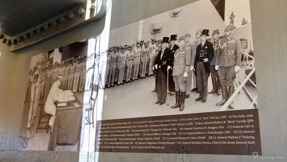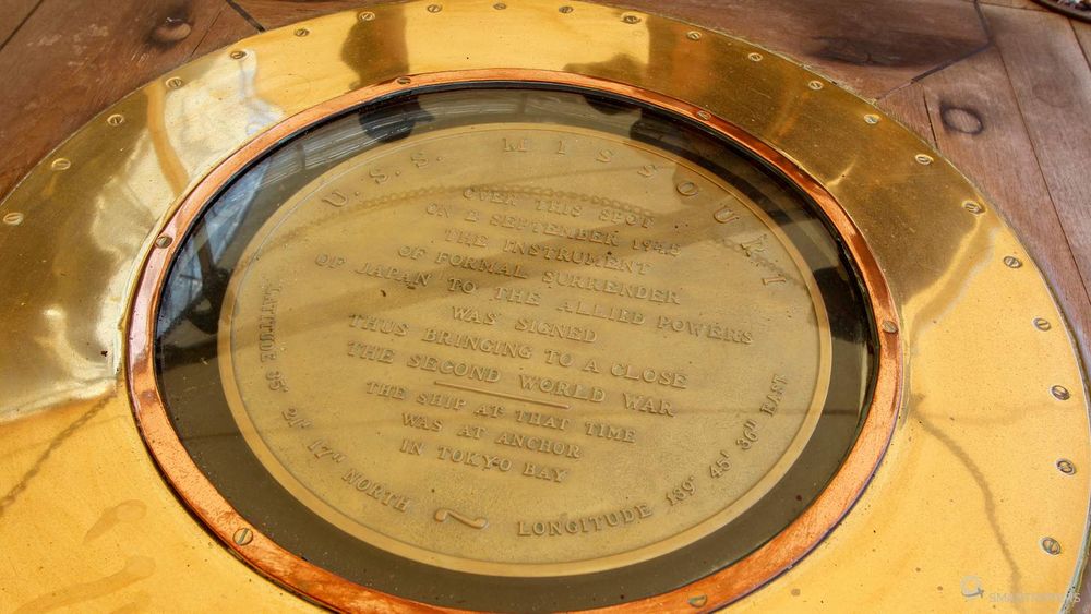 Au-delà de ses faits d'armes, Big Mo restera un haut lieu de l'histoire avec un grand H. C'est en effet sur son pont, côté droit à proximité de la tourelle supérieure qu'à été signée la capitulation du Japon en 1945 et par extension la fin de la seconde guerre mondiale, au coeur de la baie de Tokyo. L'emplacement est symbolisé par une plaque de métal et de verre à l'endroit exact de la signature.