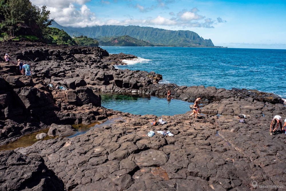 Le premier point d'intérêt en arrivant à Princeville est le célèbre Queen's bath, un petit bassin naturel en bordure d'océan que les vagues viennent remplir lorsque la mer est agitée. Il s'agissait autrefois d'un lieu dont l'accès était réservé à la royauté, d'où son appellation de "bain de la reine".