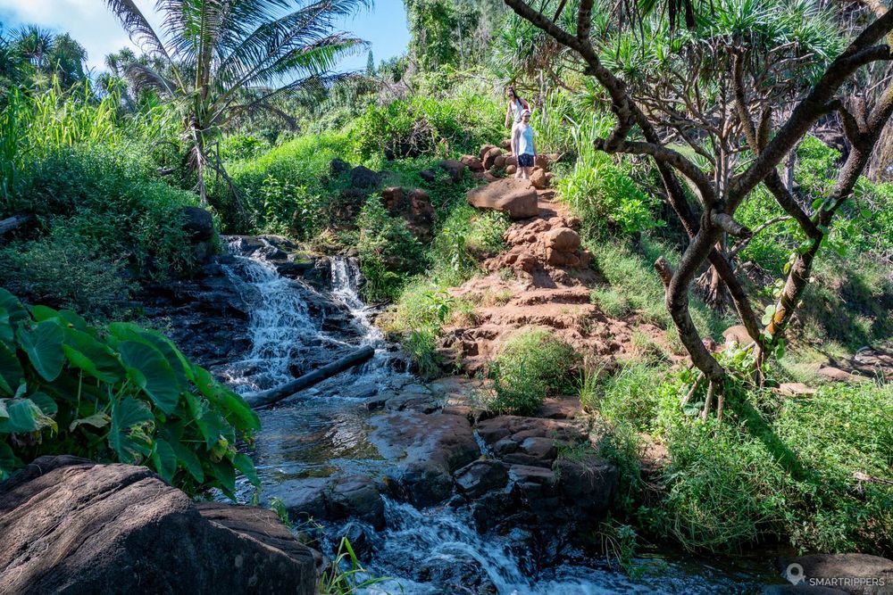 Le cadre est charmant et verdoyant, au bord de la rivière et au pied de la Na Pali coast. Un sentier est aménagé avec plusieurs escaliers et permet de faire une boucle d'environ 1km, passant a proximité de nombreuses plantes et arbres. Un guide détaillé en anglais vous donnera de nombreuses explications sur les plantes, leur histoire et leur utilisation dans la vie courante des premiers Hawaiiens. On regrette par contre qu'il n'y ait pas plus de fleurs.