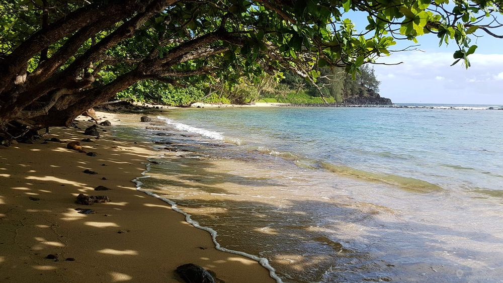 La partie Est de Lumahai n'est pas visible de la route. Il faudra descendre via un petit sentier pour y accéder et la découvrir. Une fois au bord de l'eau, on y découvre une belle bande de sable bien large et entourée d'arbres avec quelques rochers, ce qui rend l'endroit vraiment charmant. Il sera très facile d'y trouver un peu d'ombre sur la plage.