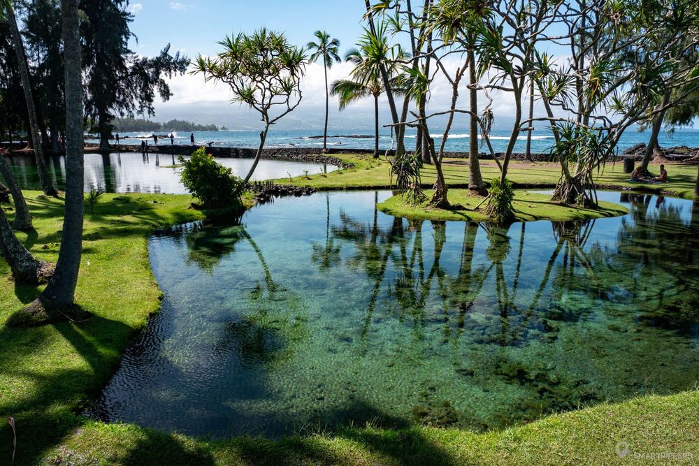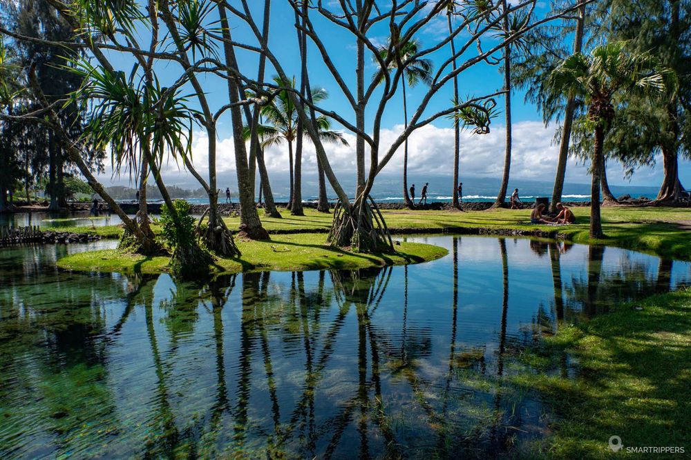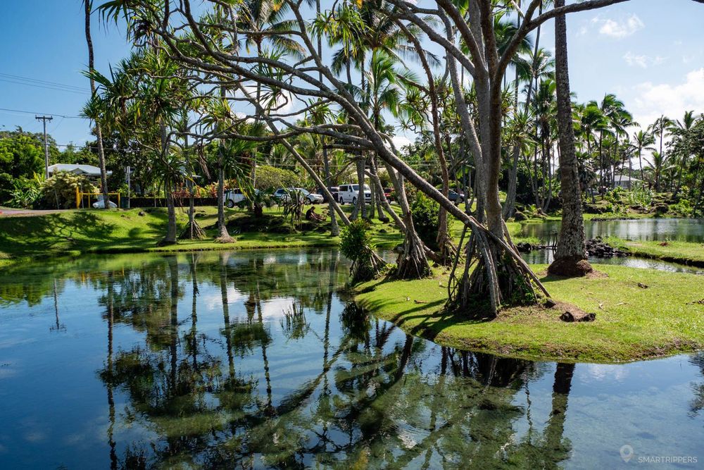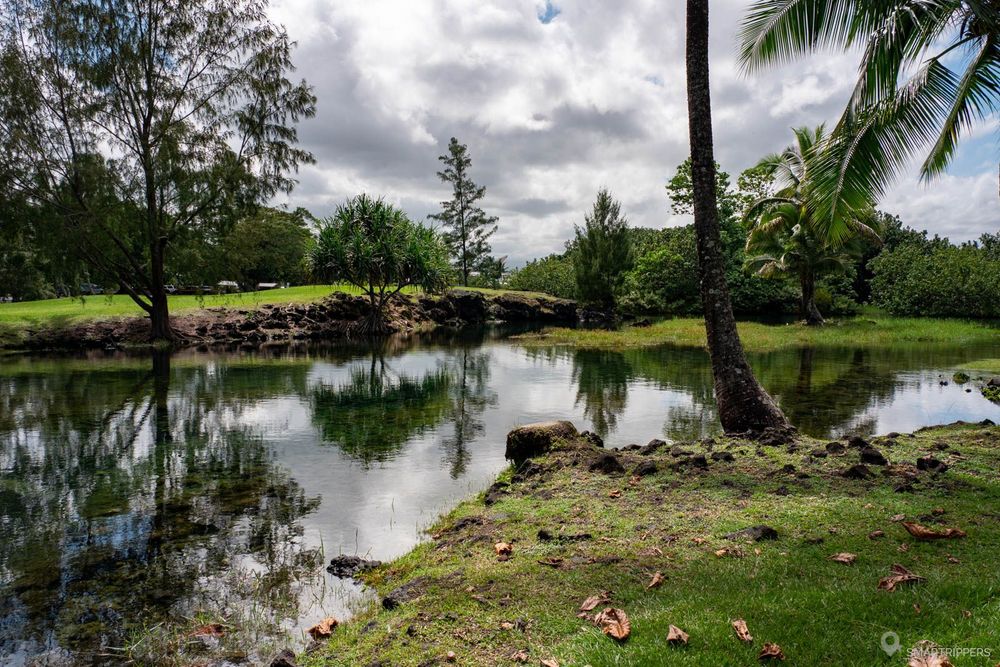 Voici l'un des lieux les plus populaires d'Hilo, et l'on comprend vite pourquoi! A peine arrivé, nous sommes accueillis par de superbes petits étangs d'eau où le ciel et les palmiers se reflètent. C'est magnifique!