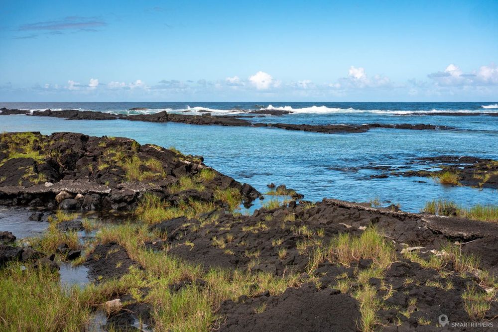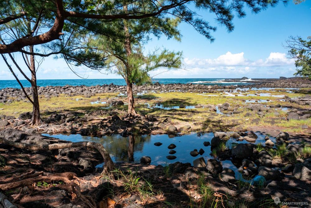 La côte à l'Est d'Hilo est parsemée de petits Beach Park qui offrent tous un accès à l'océan. Ici la côte a été sculptée par les coulées de lave successives qui sont venues former de petits étangs et piscines naturelles au bord de l'eau.