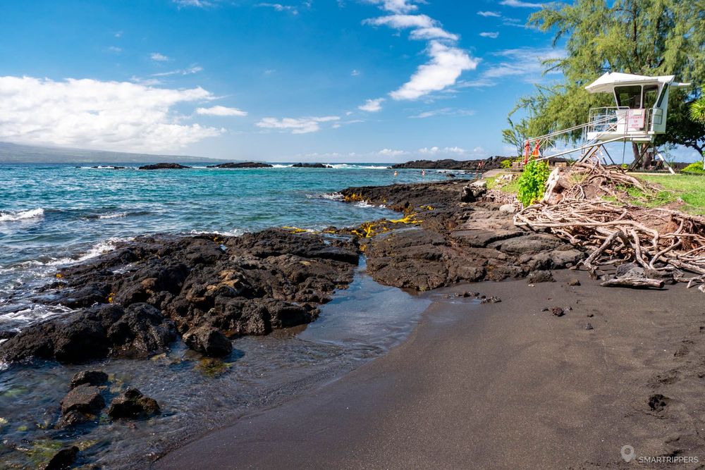 En s'avançant vers la droite du parc, on trouvera une petite plage de sable noire où la baignade est surveillée. Il s'agit des rares plages de sable d'Hilo. Bien qu'assez petite, elle permet d'entrer dans l'eau assez facilement, bien qu'il faudra prévoir de petites chaussures aquatiques car les rochers sont nombreux dans l'eau.